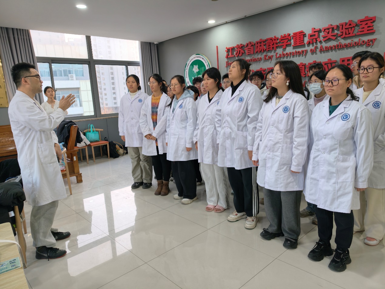 2025年11月13日至11月28日,江苏省麻醉学科普教育基地分批组织2025级麻醉学专业新生走进麻醉学重点实验室,开展“早科研”启蒙科普活动。活动期间,具有海外科研背景的教授们讲述了留学经历与科创感悟;基地教师则引导各批次本科生依次探访生物芯片室、电生理室、基因功能分析室及行为学实验室等功能区域,通过大型精密仪器展示、“水迷宫”“旷场实验”等实验演示,帮助新生直观理解麻醉医学科研逻辑,激发对医学科研的兴趣。