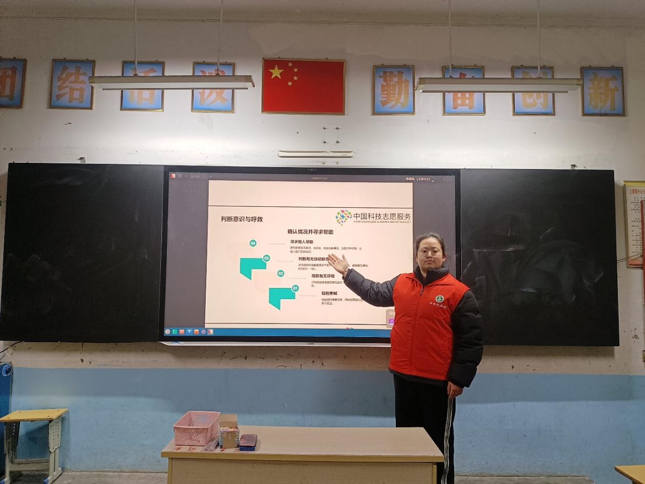 志愿服务队成员结合乡村学生认知特点,用通俗易懂的语言讲解心肺复苏的核心原理,重点强调“黄金4分钟”的急救关键期,通过拆解“叫—叫—C—A—B”口诀,将复杂的操作流程转化为清晰易懂的步骤,同时配套科普自动体外除颤器(AED)的基础使用方法,让专业知识不再抽象。实操演练环节,志愿者借助基地专业模拟人教具,手把手指导同学们找准胸外按压位置、掌控按压力度与节奏。同学们热情高涨,踊跃参与实操体验,在反复练习中牢记操作要领,切实掌握了基础急救技能。